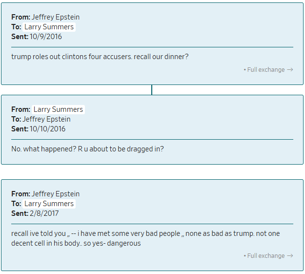 还有大量邮件来自其他一些与爱泼斯坦关系密切的知名人士,例如前哈佛大学校长拉里·萨默斯。萨默斯经常与爱泼斯坦通信,包括关于女性的调侃,以及2019年爱泼斯坦被捕前不久的一段交流。萨默斯在2023年告诉《华尔街日报》,他对自己在爱泼斯坦定罪后仍与其保持联系“深感后悔”。他未就此次公布的邮件作出回复。